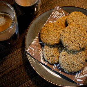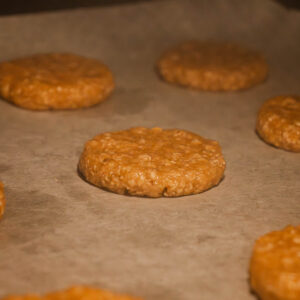 - Kuglerne lægges på en bageplade med bagepapir og trykkes flade – De skal være ca på tykkelsen med en lillefinger.