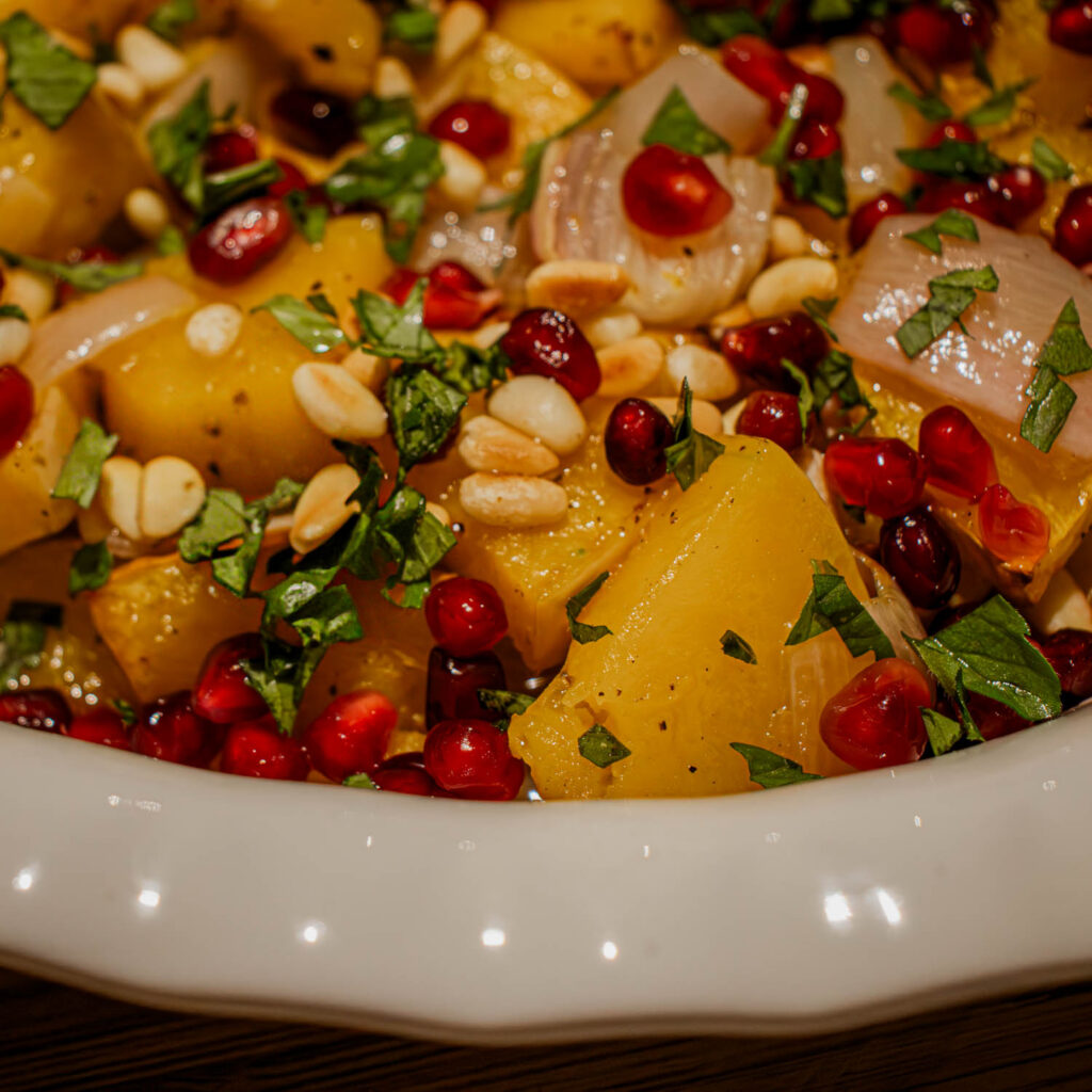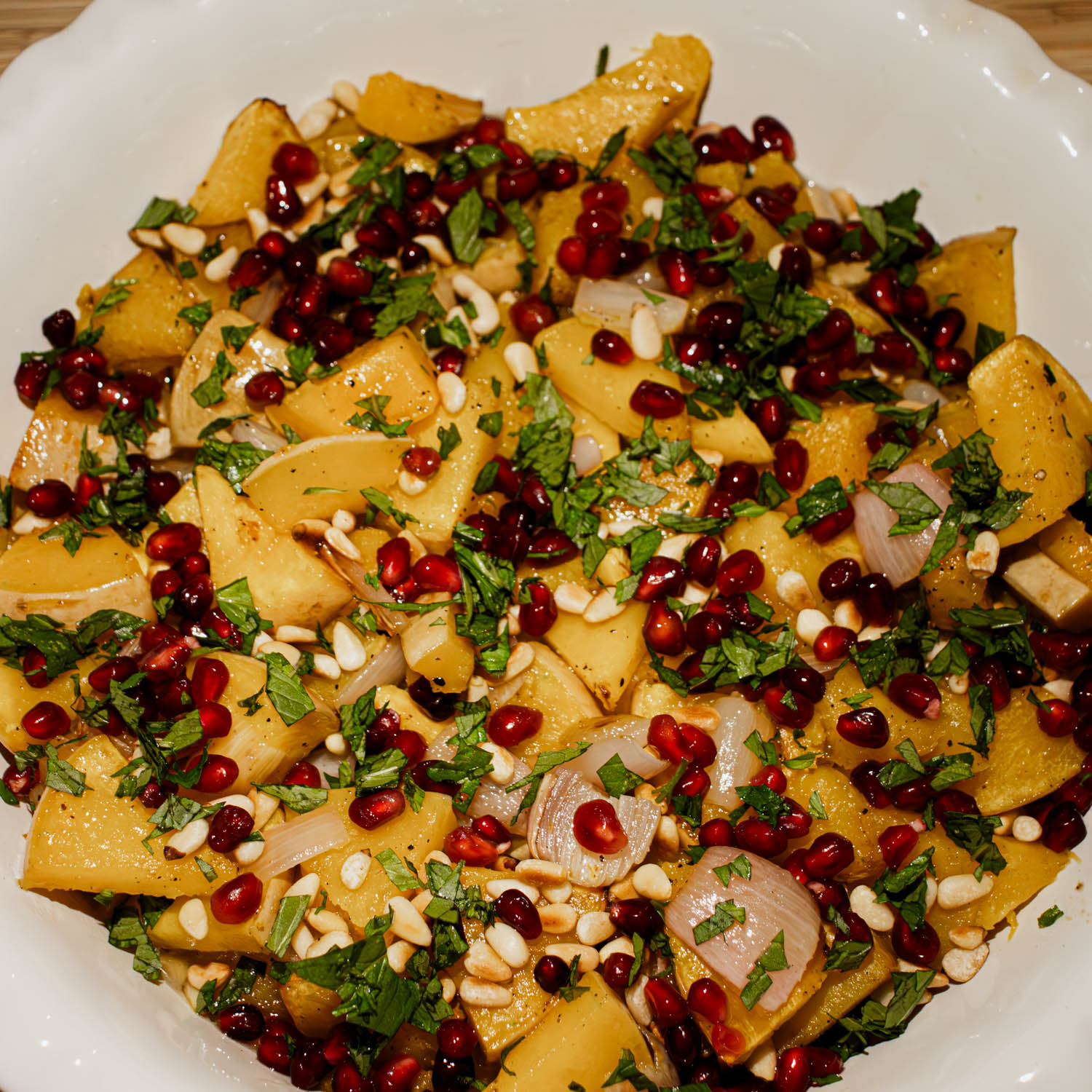 - Fadet toppes med granatæblekerner, ristede pinjekerner og hakket mynte