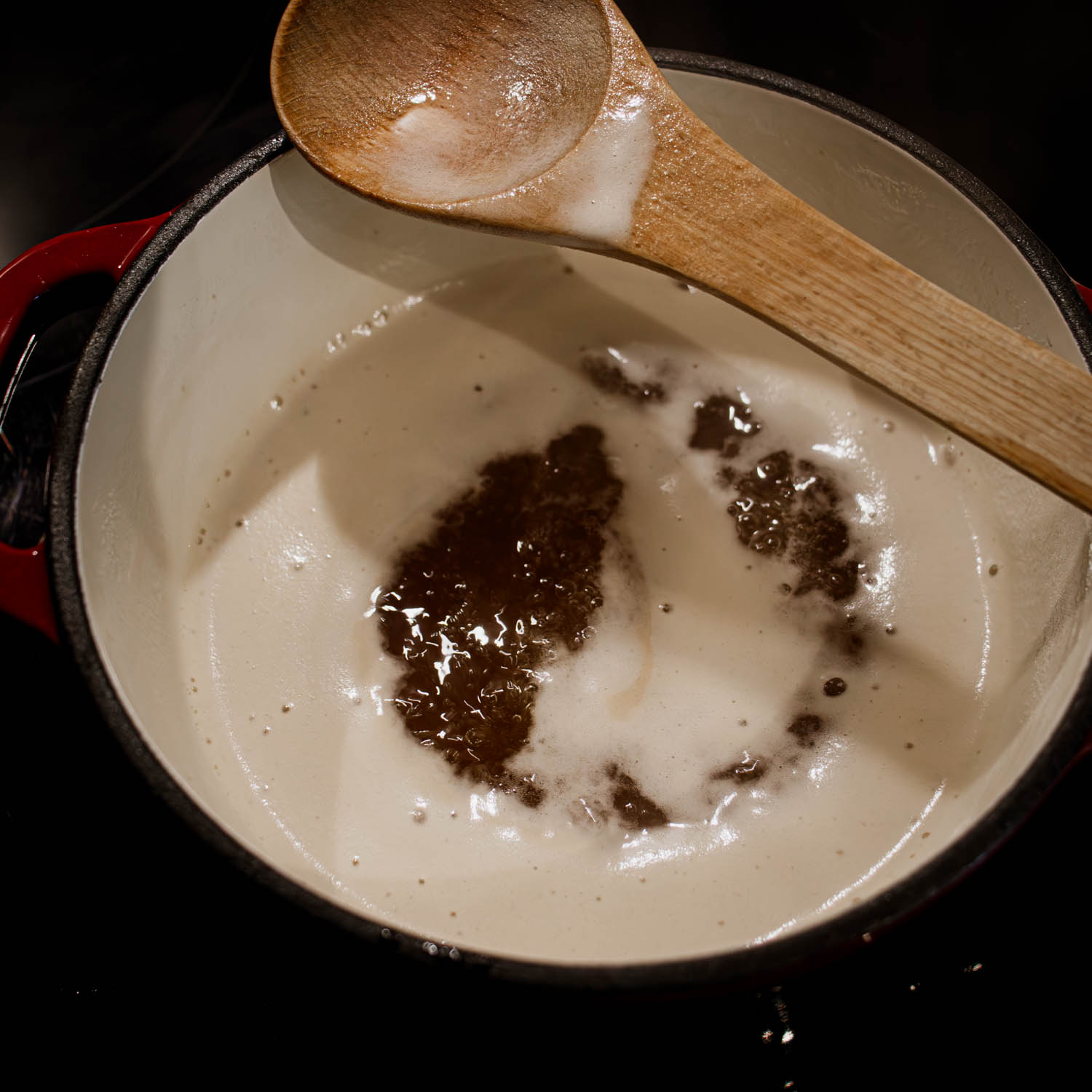 - Imens hældes honning og de 185ml vand i en gryde, og bringes i kog under omrøring. Lade det boble i 3-5 minutter