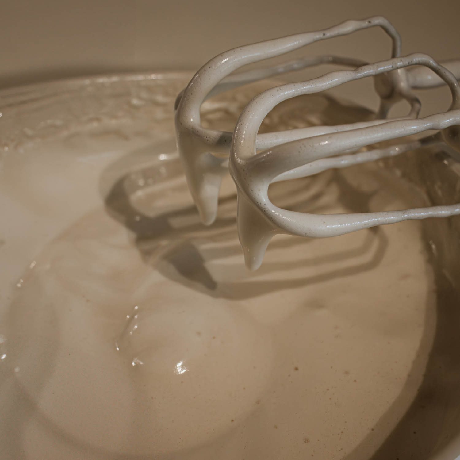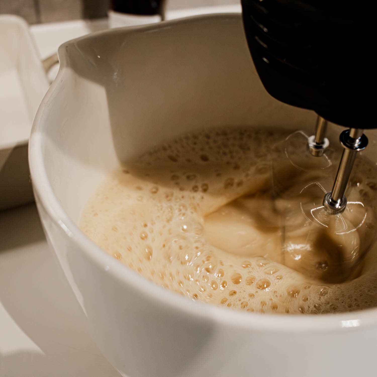 - Husblassen tilføjes til honningblandingen, og piskes først på laveste niveau, og skrues derefter gradvist op
