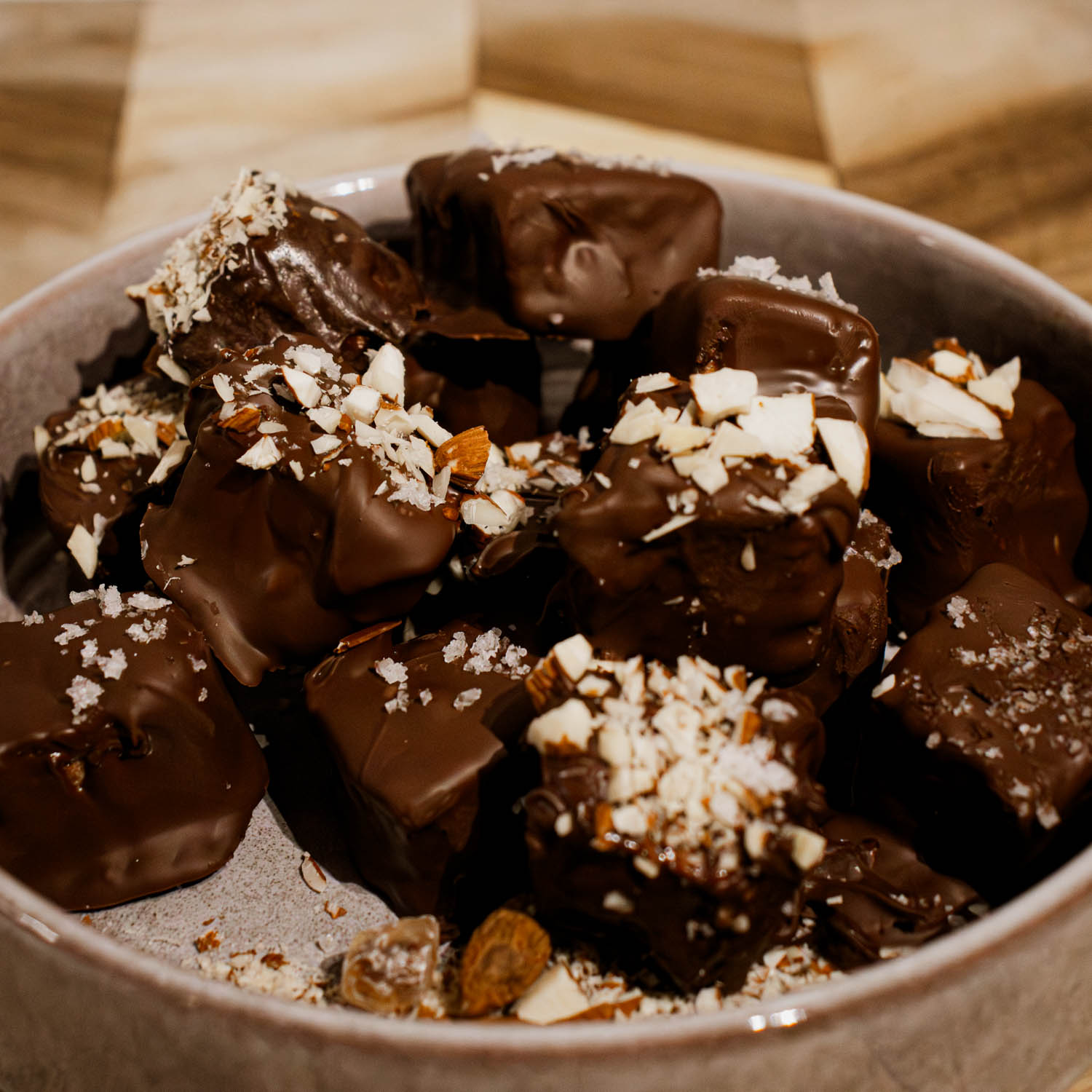 Favoritten herhjemme er at overtrække skumfiduserne med mørk chokolade, og fryse lidt flage salt og hakkede mandler på.